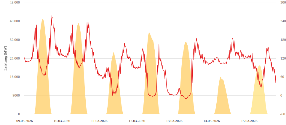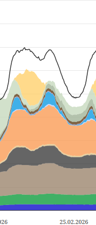 Saisonbedingt hatten wir nur wenig Solarstrom, für einen kurzen Moment mal bis zu 13 GW. Wind on- und offshore pausierten heute und lieferten weniger als 10GW. Interessant ist, dass auch heute wieder massenweise Gas verstromt worden ist.